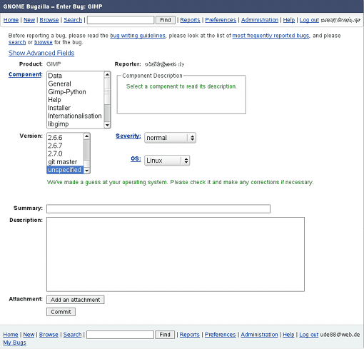You can skip the above steps and go directly to http://bugzilla.gnome.org/enter_bug.cgi?product=GIMP (You still have to login, of course.) |