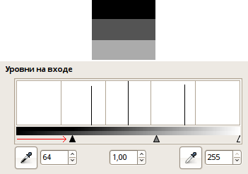 Три треугольника как ползунки: один чёрный для тёмных тонов (теней), один серый для средних тонов (гамма), один белый для светлых тонов (отблески).