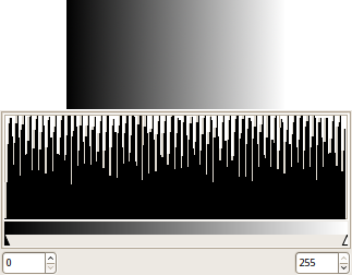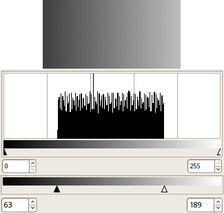 Исходным изображением является градиент RGB от чёрного цвета (0;0;0) к белому (255;255;255). Поскольку для уровней выхода нет гистограммы, здесь используется гистограмма, диалог которой открывается командой → .